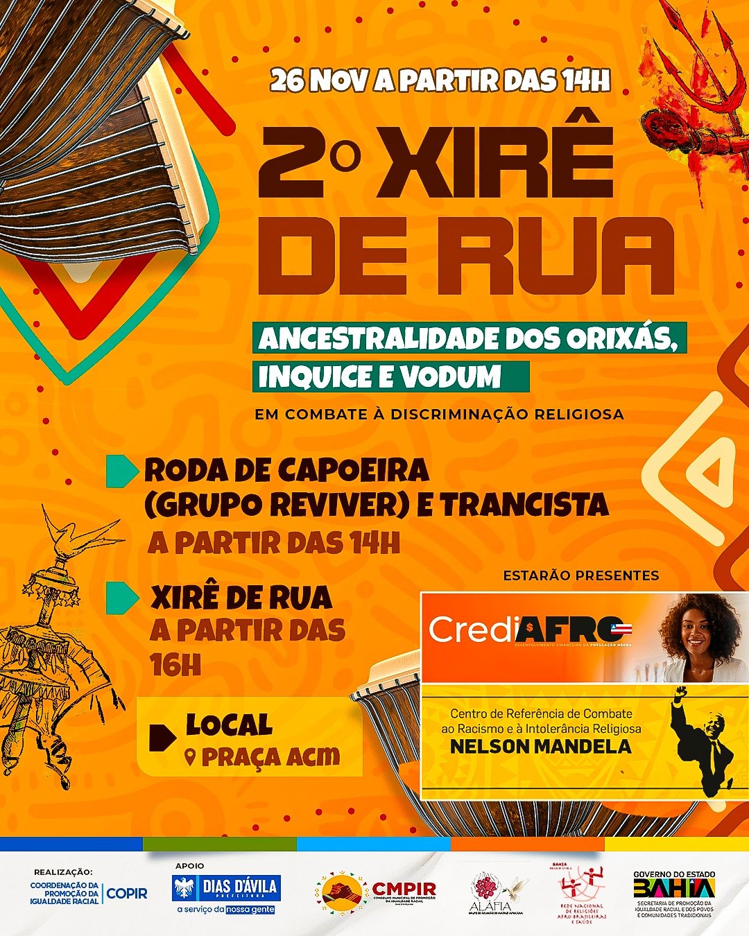 2 xire de rua da cidade de Dias D'Ávila,será no dia 26 de novembro da 2024,as 17h,na praça central,com a apoio da prefeitura, coopir e grupo ALÁFIA ( grupo de religião de matriz africana)para resgate de cultura e tradições da nossa religião