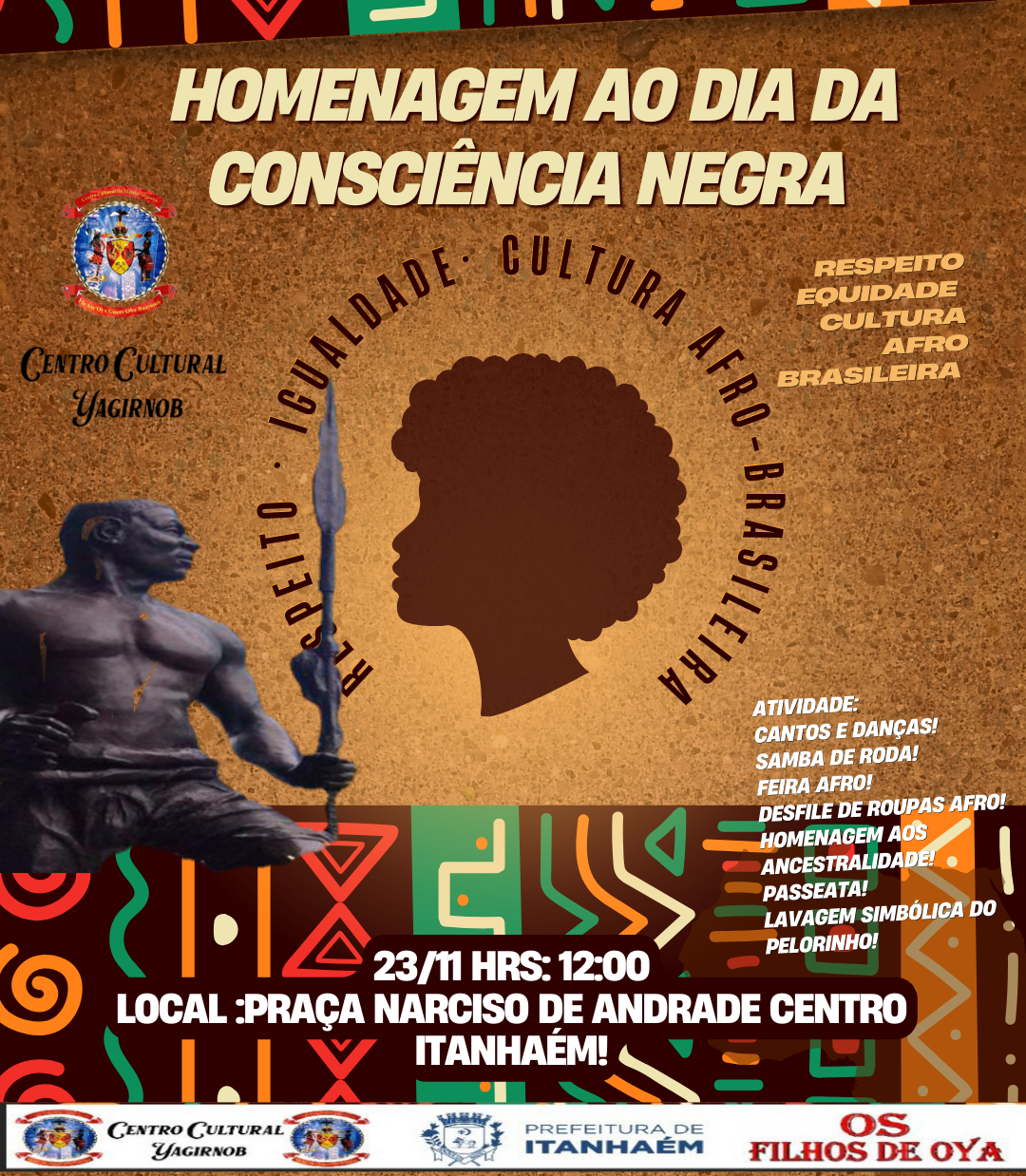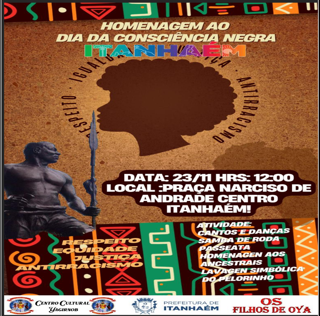 Comemoração a dia Consciência Negra de Itanhaém.Será realizado sábado 23 de novembro na praça Narciso de Andrade centro de Itanhaém, início às 12:00 as 18:00 Convidamos todos que apoia e luta em devesa pela direitos da população negra e que combata o racismo e preconceito, e chamamos a população de Itanhaém para apreciar a cultura negra da cidade de Itanhaém, uma tarde com muita diversão, alegria, cultura negros teremos diversas atração artísticas :APRESENTAÇÕES: ✅Grupo de capoeira União de Itapuã mestre Itapuã, ✅grupo cultural os filhos de Oya, ✅Cigana do Oriente, Cigana Sarita, ✅Família trinca de Az (Samba de Roda), ✅Capoeira (união de Itapuã ✅Teatro galpão com peças teatral (MENINA PRETINHA ) ✅Afoxé Awon Akorin Efon, ✅Xire aos orixás, ✅homenagem a dona Laura do Kilombo ✅marcha aos ancestrais com lavagem simbólica ao pelourinho!✅O evento tem o intuito de promover e dar visibilidade a população negra e da sua cultura afro brasileira que vem sofrendo um pagamento histórico dos feitos e o quanto contribui para a formação da sociedade e do Brasil.O evento será realização pelo ponto de cultura centro cultural yagirnob e projeto os filhos de oya, com o apoio institucional da prefeitura de Itanhaém.Organizadora: Oyayemi Shywa (mãe Silvia)Produtor Geral: Edson MaurícioA apresentação do projeto os filhos de Oya conta com o apoio da lei Paulo Gustavo, Governo federalE um dever de todos seja Negro ou Branco combater o preconceito e o racismo, faça parte você também dessa ação tão necessária para a formação de uma sociedade mais justa e igualitária para todos